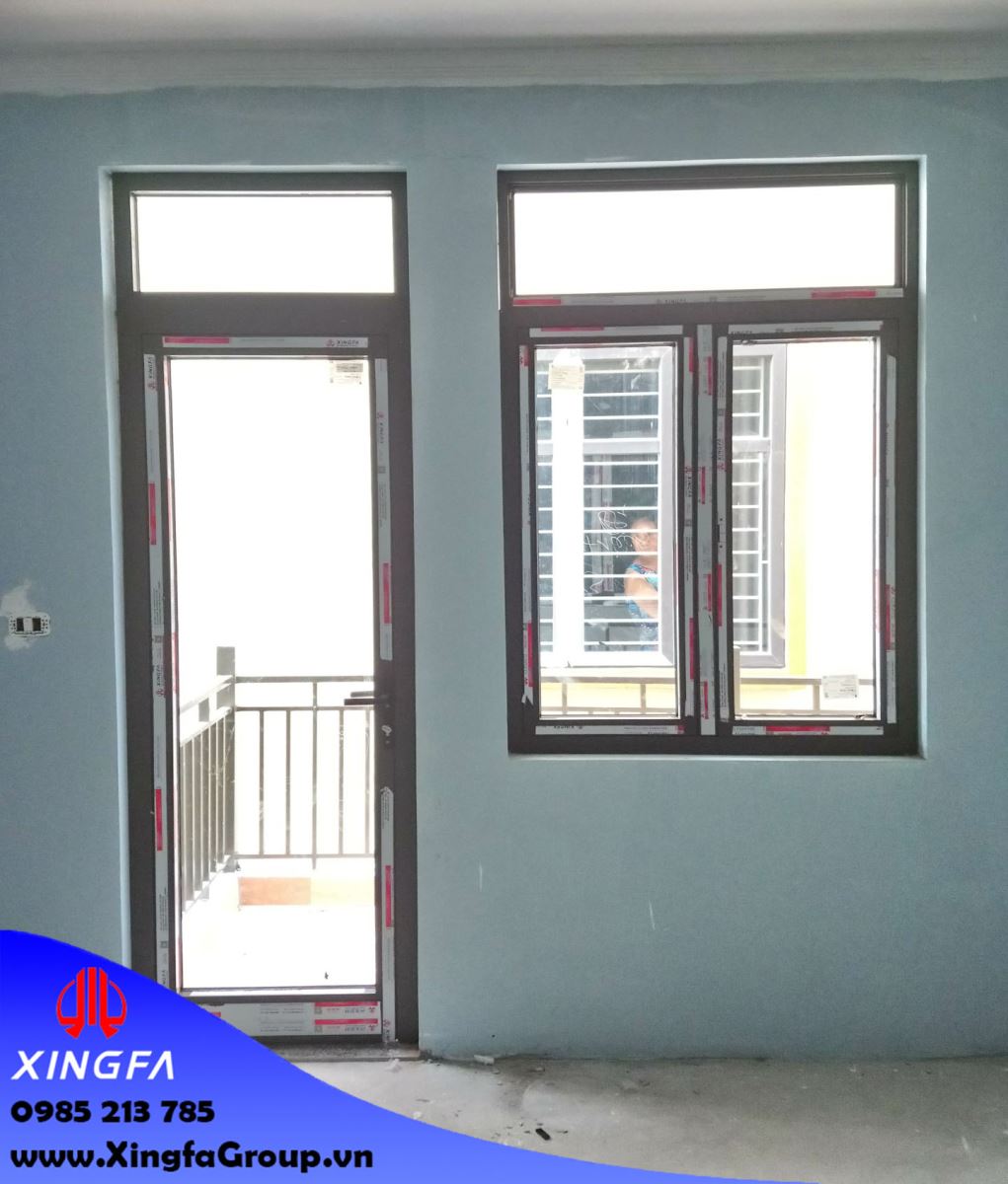 Đây là hình ảnh bộ cửa lắp đặt tại vị trí ra ban công, là mẫu cửa sổ mở quay 2 cánh nhôm Xingfa hệ 55 có độ dày khung và cánh 1.4mm, và cửa đi mở quay 1 cánh nhôm Xingfa hệ 55 mầu nâu, cùng với vách fix cố định nhôm Xingfa bên trên. Phần ban công nhà chú Phong khá rộng rãi và đủ diện tích để có thể lắp đặt dòng cửa mở quay, trong các dòng cửa nhôm Xingfa chính hãng của Thủ Đô Group thì cửa mở quay cũng được đánh giá độ bền cao và dễ sử dụng. Ở các tầng còn lại cũng có thiết kế phần cửa ra ban công giống như vậy.