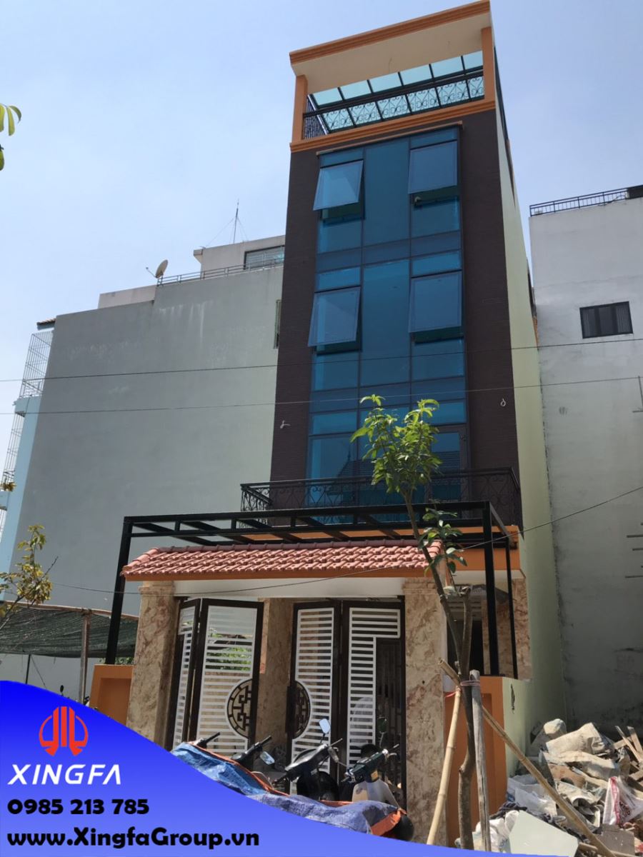 Công trình nhà anh Khải được thiết kế mặt tiền sử dụng toàn bộ hệ vách kính mặt dựng nhôm Xingfa mặt dựng kết hợp với cửa sổ mở hất nhôm Xingfa với kính của thương hiệu Hải Long mầu xanh, đã tạo nên một điểm nhấn hoàn hảo cho ngôi nhà với phần mặt kính bao phủ ở mặt tiền. Đây là kiểu thiết thế có thể thấy ở các toà nhà cao tầng có phong cách kiến trúc hiện đại, có tính thẩm mỹ rất cao.