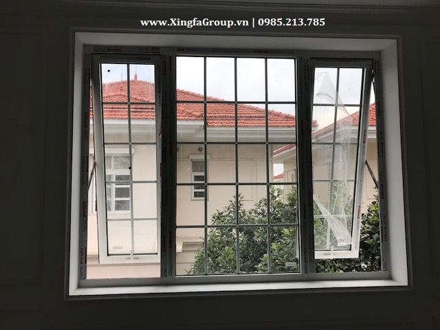 Mẫu cửa sổ mở hất 1 cánh ở 2 bên, vách kính cố định nhôm Xingfa ở giữa trên cùng một khuôn cửa