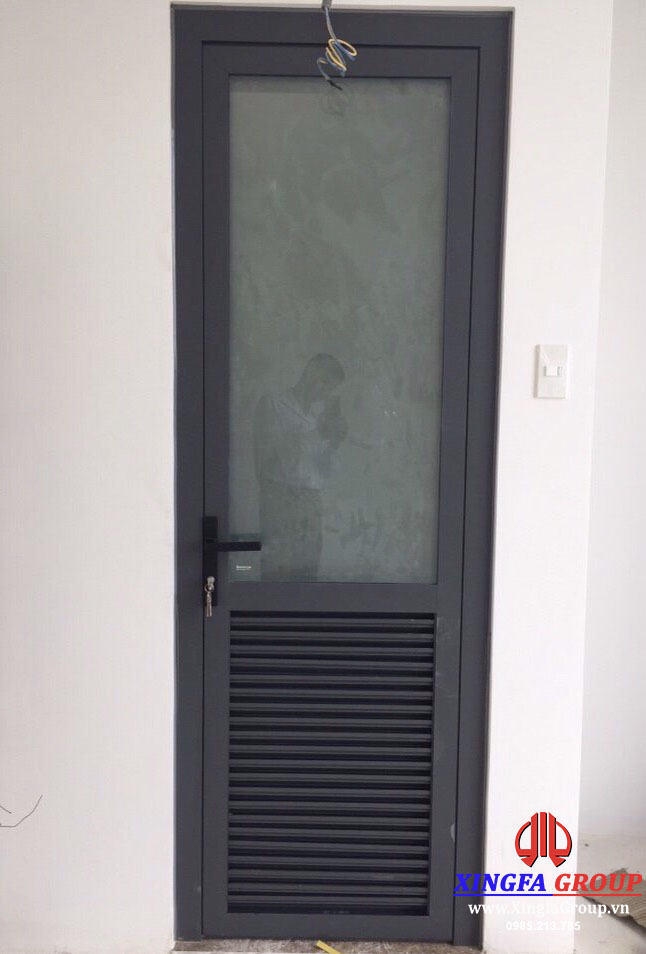 Cửa đi mở quay 1 cánh kết hợp giữa kính dán an toàn và chớp nhôm Xingfa