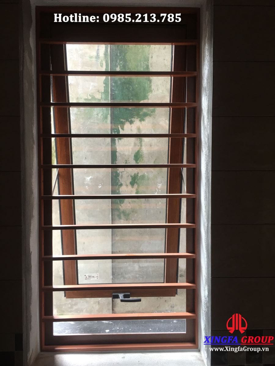 Mẫu cửa sổ mở hất 1 cánh được lắp ghép từ thanh profile nhôm Xingfa mầu vân gỗ.