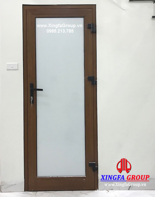 Mẫu cửa đi mở quay 1 cánh nhôm Xingfa mầu vân gỗ kết hợp với kính mờ của Hải Long Glass và bộ phụ kiện cao cấp Kinlong.