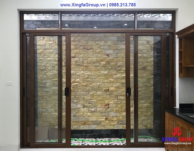 Mẫu cửa đi mở trượt 4 cánh nhôm Xingfa mầu vân giả gỗ hệ 93 dầy 2.0mm.