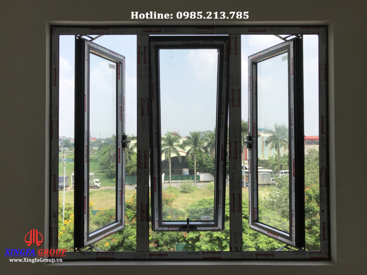 Cận cảnh mẫu cửa sổ mở quay 2 cánh ở giữa là cửa sổ mở hất 1 cánh nhôm Xingfa tem đỏ Quảng Đông có đầy đủ mã CO, CQ.