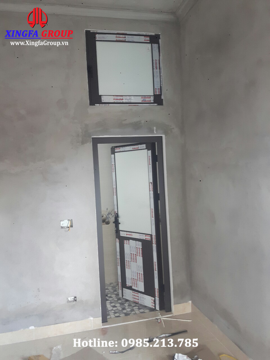Mẫu cửa đi mở quay 1 cánh và cửa sổ mở quay 1 cánh nhỏ ở phía trên bằng nhôm Xingfa nhập khẩu 100% tem đỏ Quảng Đông chuẩn mã code QR