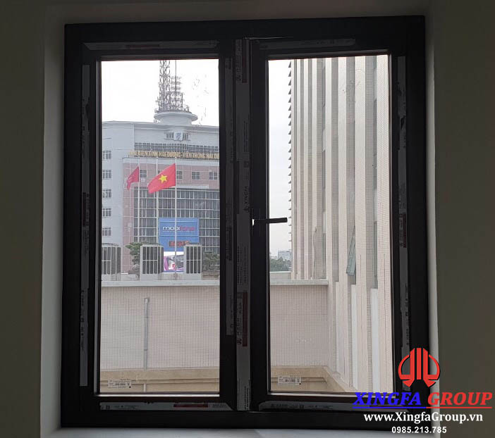 Cửa sổ mở quay 2 cánh nhôm Xingfa màu nâu