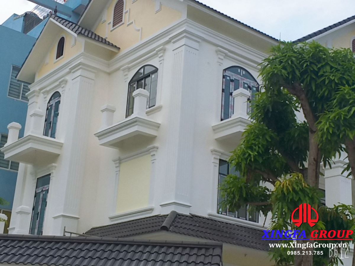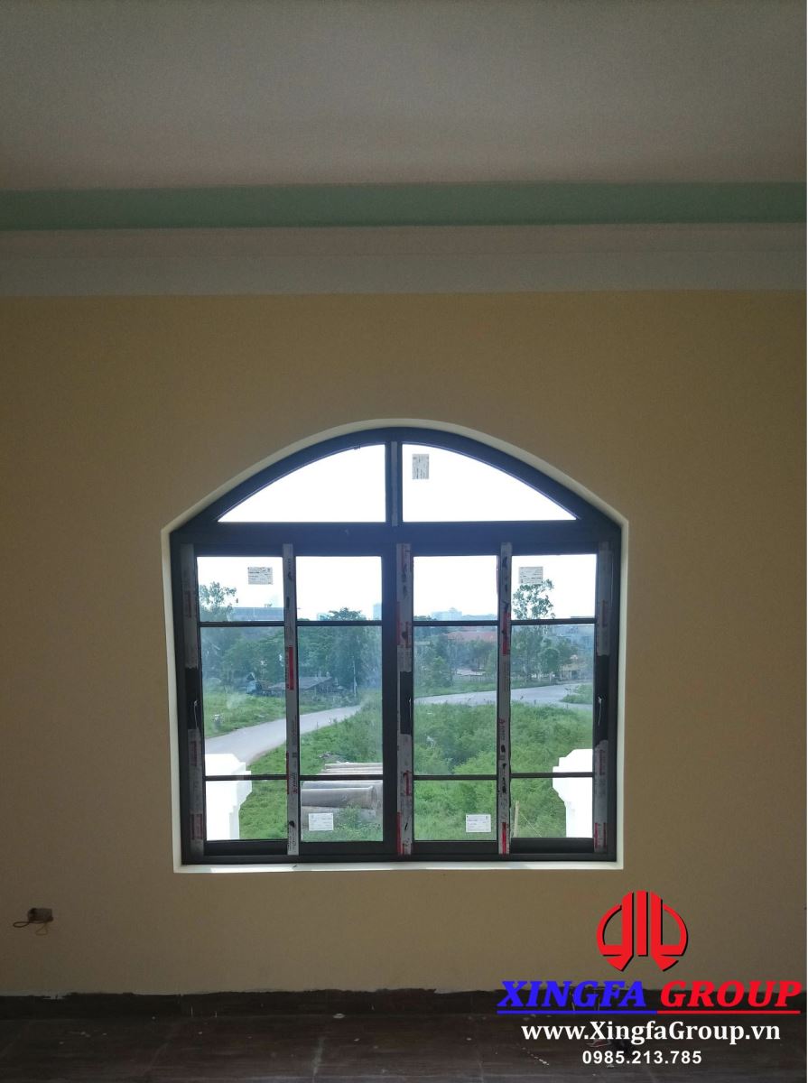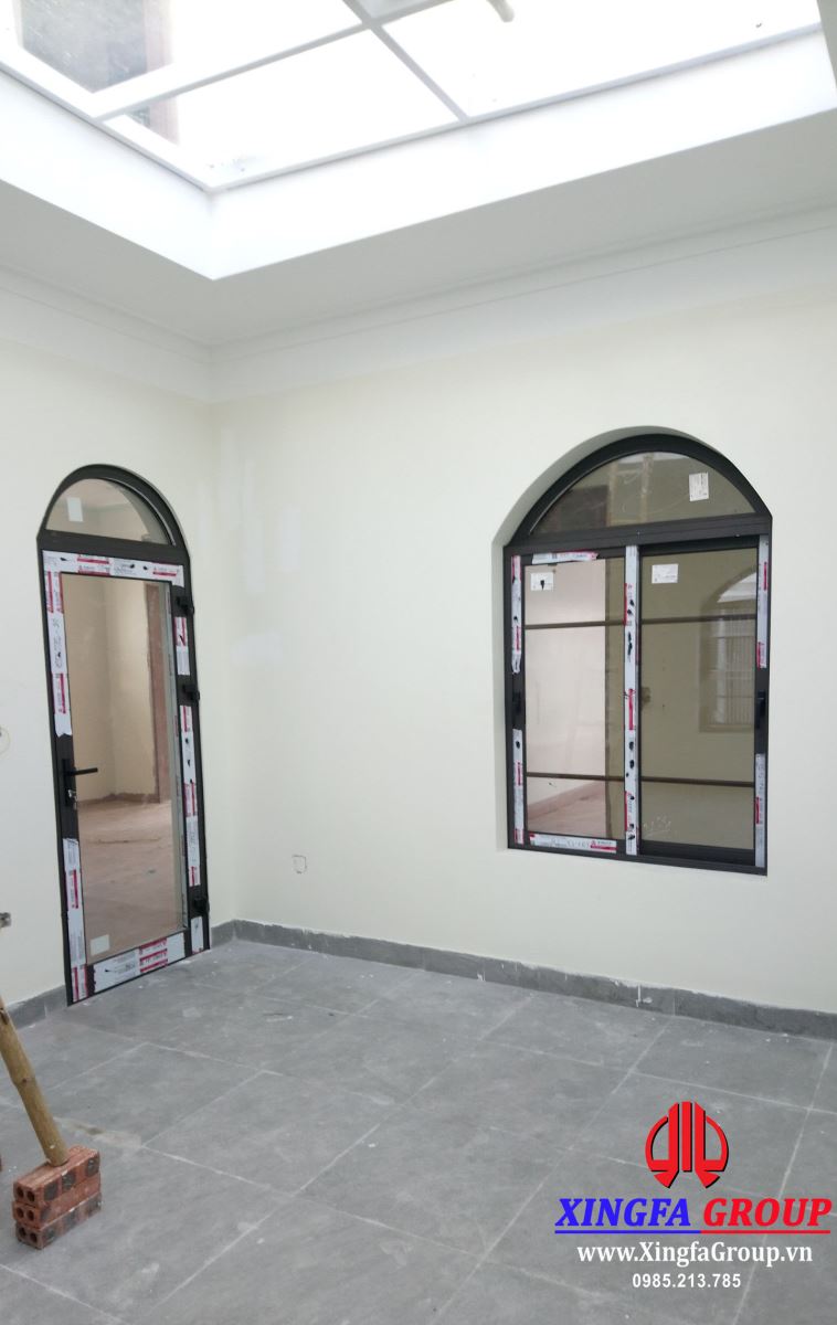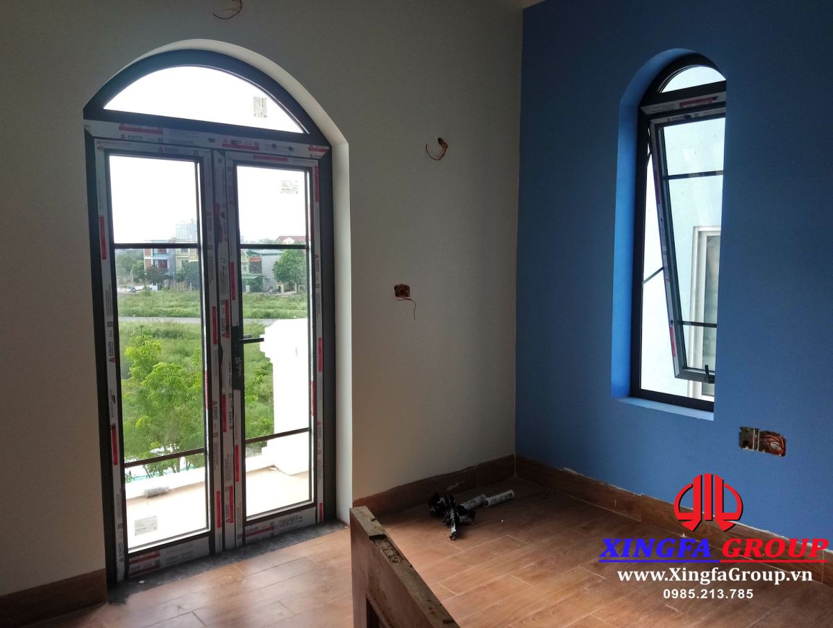 Toàn bộ hệ thống cửa sổ, cửa đi ra ban công, cửa đi thông phòng trên tầng 3 đều sử dụng mẫu cửa nhôm Xingfa ở phía dưới kết hợp với vách kính cố định uốn vòm trang trí ở bên trên. Các vách kính được chia đố nhôm Xingfa để tạo nên vẻ đẹp đồng bộ với các bộ cửa nhôm Xingfa sử dụng kính hộp có nan trang trí ở phía dưới.