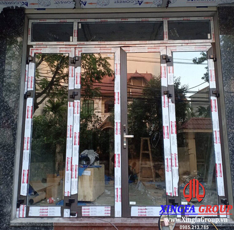 Cửa đi mở quay 4 cánh nhôm Xingfa màu nâu sử dụng khóa vân tay