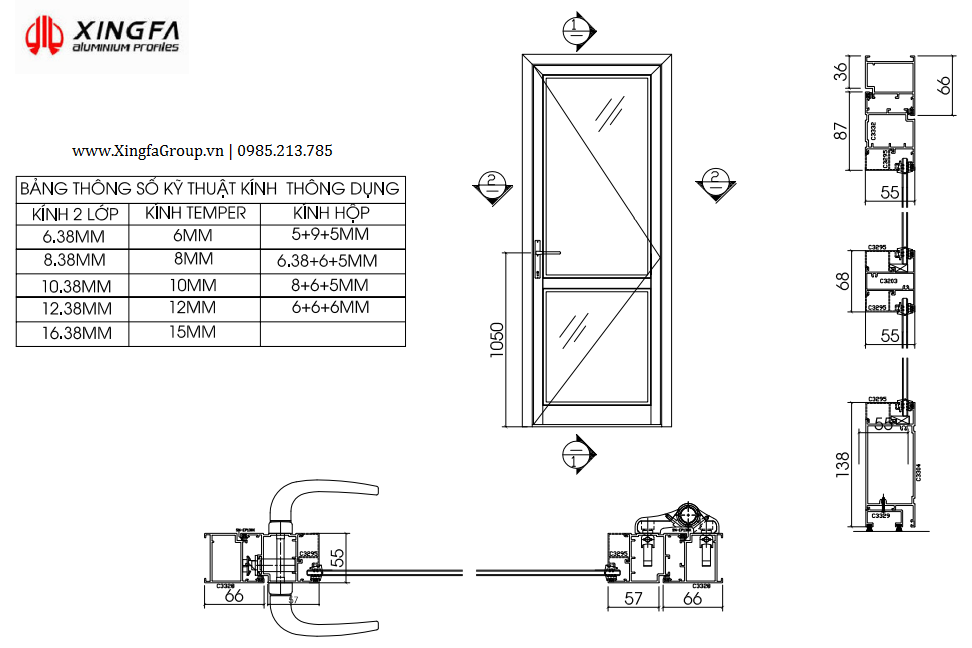Bản vẽ thông số kỹ thuật mẫu cửa đi mở quay 1 cánh nhôm Xingfa nhập khẩu