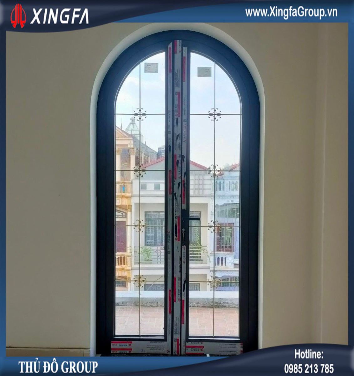 Mẫu cửa đi mở quay 2 cánh nhôm Xingfa uốn mái vòm cong (Sử dụng kính hộp 2 lớp cách âm cách nhiệt có nan trang trí mạ đồng bên trong)