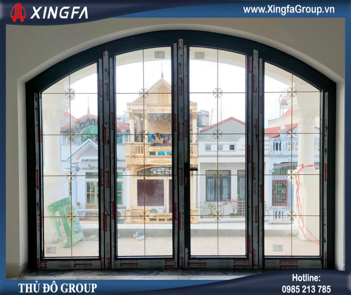 VIDEO Cửa nhôm Xingfa uốn mái vòm dùng kính hộp có nan trang trí