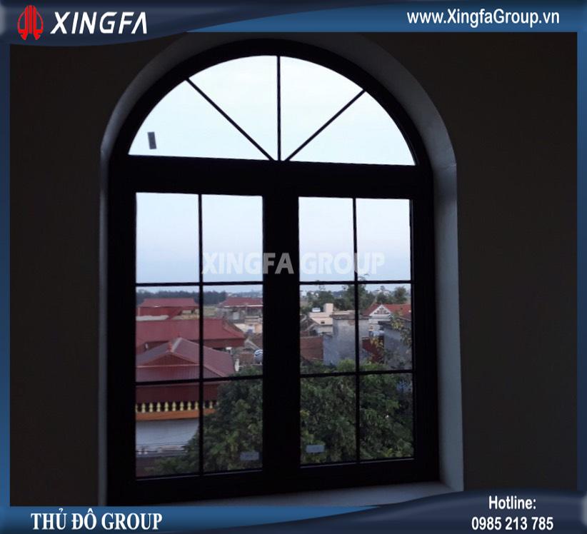 Mẫu cửa nhôm Xingfa uốn mái vòm cong với thiết kế hệ cửa sổ mở quay 2 cánh, sử dụng kính hộp 2 lớp cách âm cách nhiệt có nan trang trí bên trong mầu trắng..