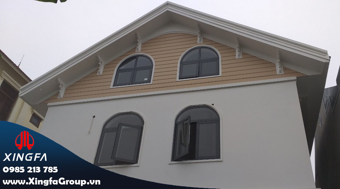 Cùng lắp đặt tại mặt tiền là bộ vách kính cố định và chớp nhôm Xingfa, với phần vách kính cũng được uốn vòm cùng thiết kế với bộ cửa ban công mà chúng tôi giới thiệu ở trên. Nhờ vậy mà đã thu hút sự chú ý ngay từ lần đầu nhìn vào mặt tiền của công trình. Ngoài ra, còn có các mẫu cửa sổ đã được lắp đặt như cửa sổ mở quay 1 cánh, 2 cánh, cửa sổ mở hất 2 cánh nhôm Xingfa.