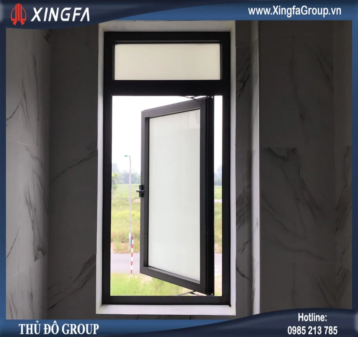 Mẫu cửa sổ mở quay 1 cánh nhôm Xingfa + ô fix ở giữa + bên trên
