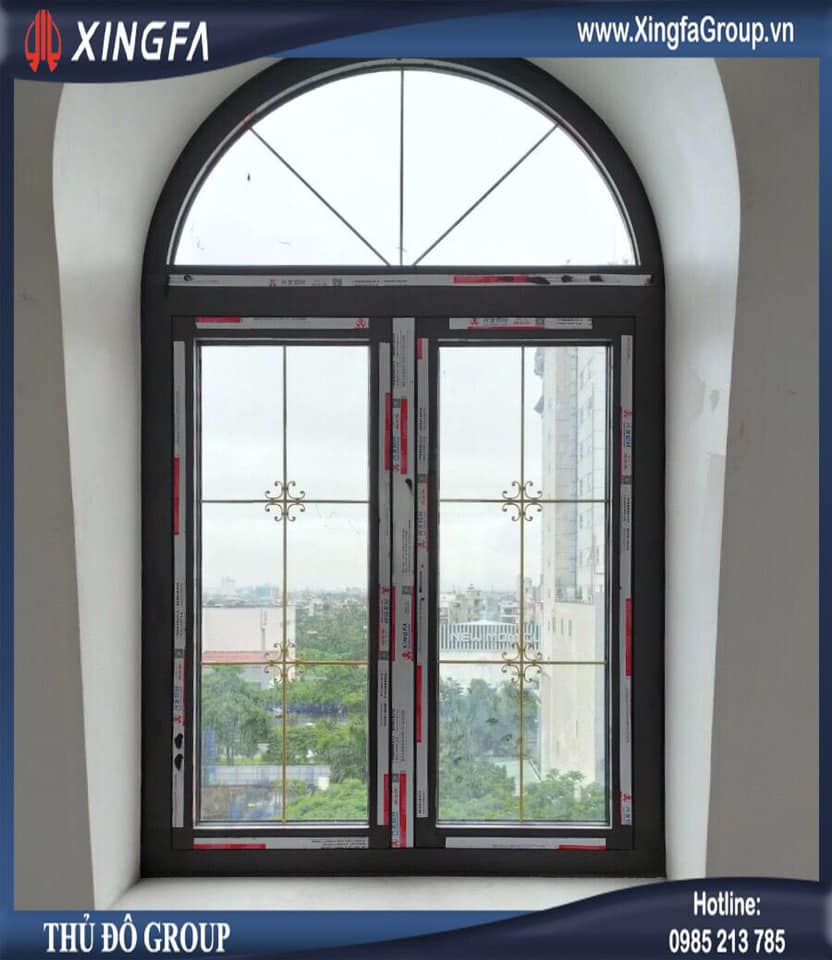 Mẫu cửa sổ nhôm Xingfa uốn vòm cong cả phần cánh + phần khung bao quanh + chia thêm đố cửa