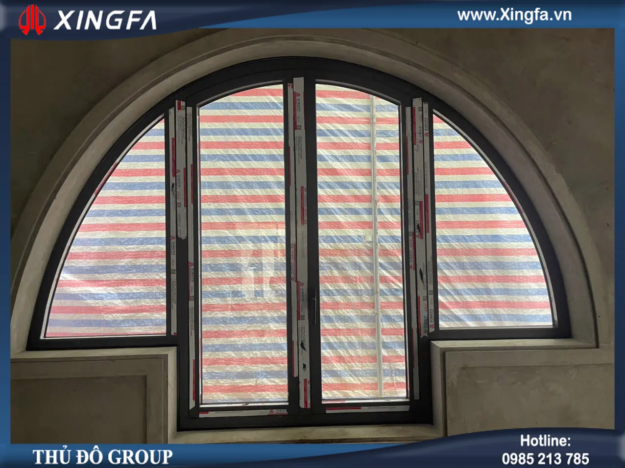 Hình ảnh mẫu cửa sổ mở quay 2 cánh kết hợp vách kính uốn vòm nhôm Xingfa nhập khẩu chính hãng