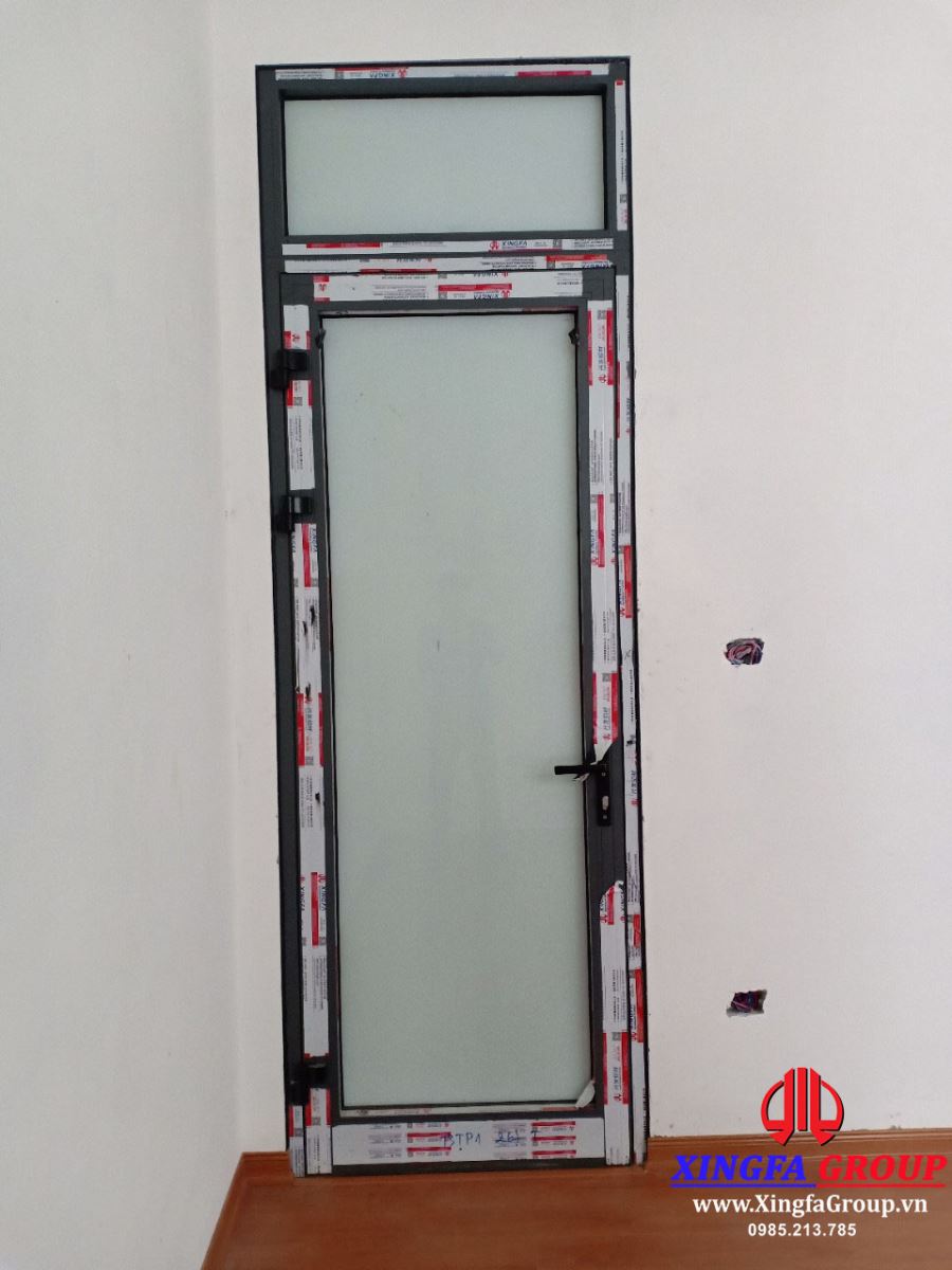 Cửa đi mở quay 1 cánh nhôm Xingfa sử dụng kính dán an toàn màu trắng sữa