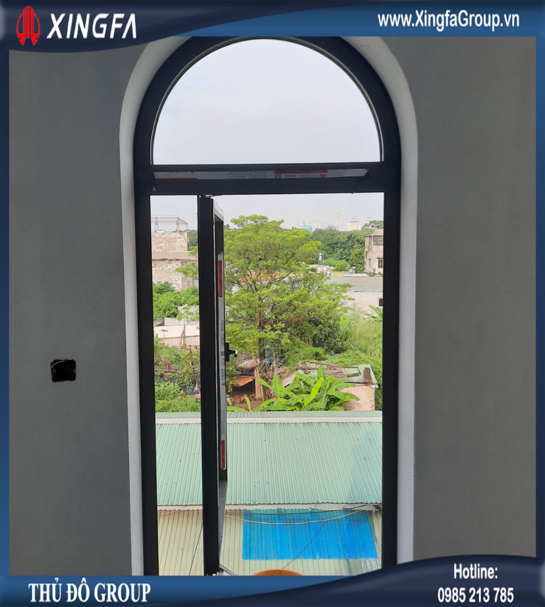 Hình ảnh cửa đi mở quay 1 cánh nhôm Xingfa mái vòm tại ban công