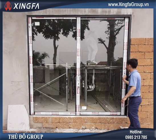 Hình ảnh cửa đi mở trượt 2 cánh nhôm Xingfa tem đỏ Quảng Đông