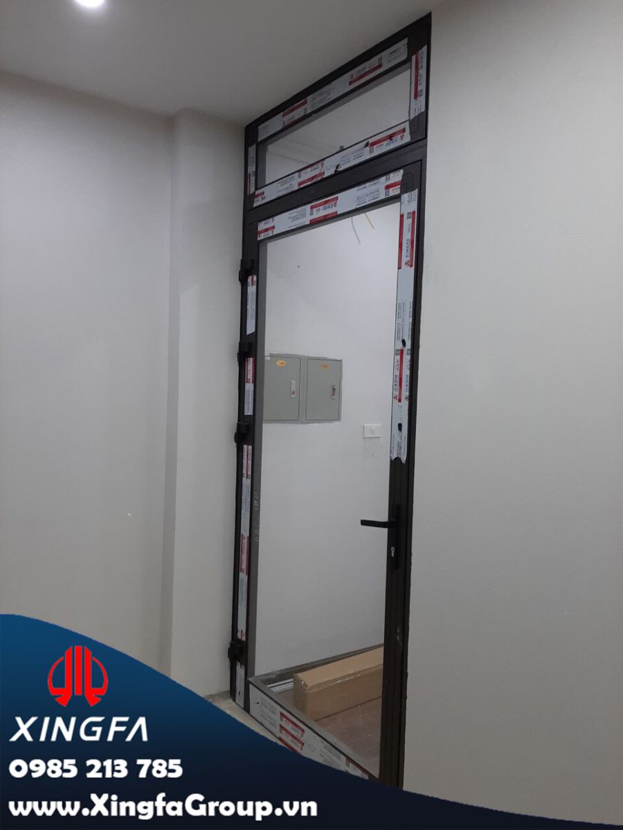 Hình ảnh cửa đi thông phòng nhôm Xingfa mở quay 1 cánh mầu ghi