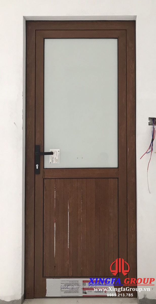Các bộ cửa đi nhà vệ sinh tại công trình đều sử dụng nhôm Xingfa màu vân gỗ kêt hợp với pano nhôm và kính dán an toàn màu trắng sữa. Đây là màu nhôm Xingfa mới xuất hiện tại Việt Nam trong 1 năm trở lại đây. Thiết kế của bộ cửa có đôi phần giống cửa nhôm trong nước do có pano nhôm bên dưới.