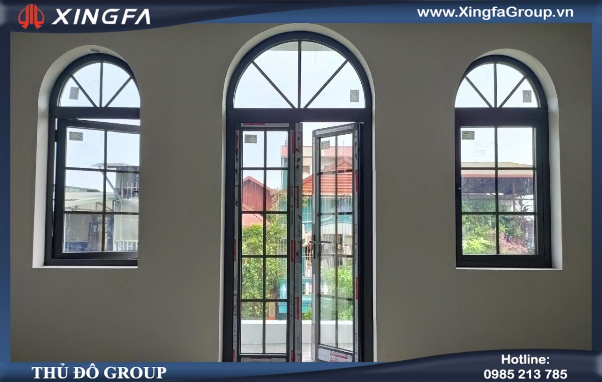Hình ảnh cửa sổ mở quay 1 cánh nhôm Xingfa có vách kính mái vòm