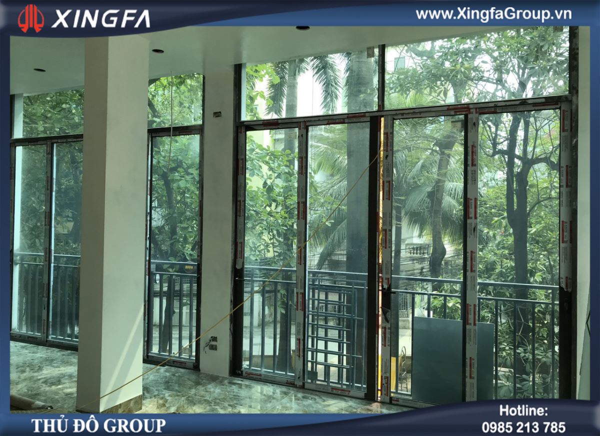 Cửa đi mở trượt nhôm Xingfa 2 cánh và 4 cánh tại đây được lắp đặt ở vị trí ban công. Đây là mẫu cửa có đặc điểm nhỏ gọn, cánh cửa chạy trên ray trượt ngang nên tốn ít diện tích, cho phép lắp đặt kích thước cửa lớn. Ngoài ra Thủ Đô Group còn sử dụng phần vách kính cố định để cách điệu cũng như làm tăng thêm diện tích lấy sáng cho toàn bộ khung cửa. Thiết kế cửa nhôm Xingfa kèm vách kính cố định này cũng rất phổ biến và được nhiều khách hàng ưa chuộng.