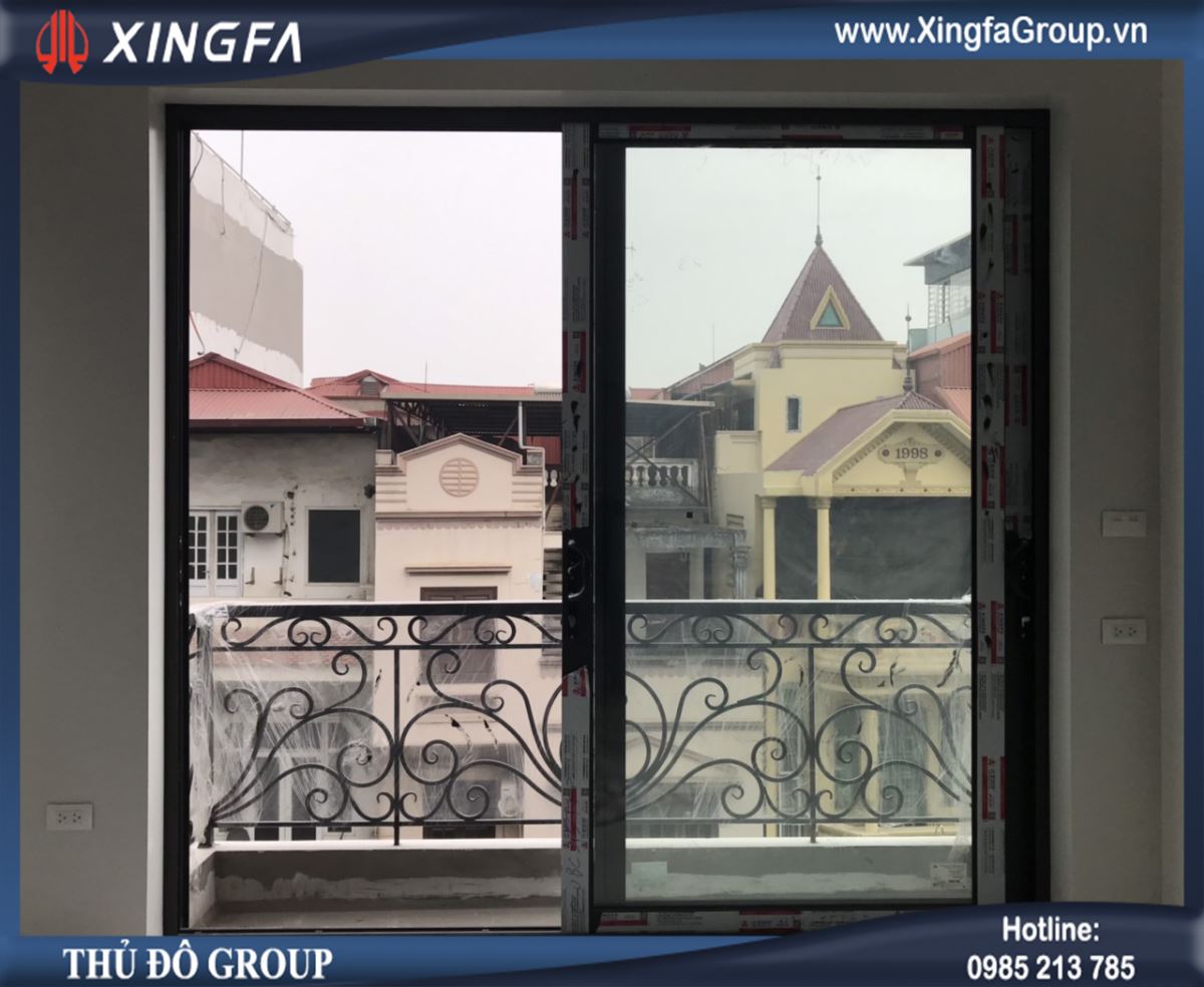 Hình ảnh cửa đi mở trượt nhôm Xingfa được lắp đặt tại ban công