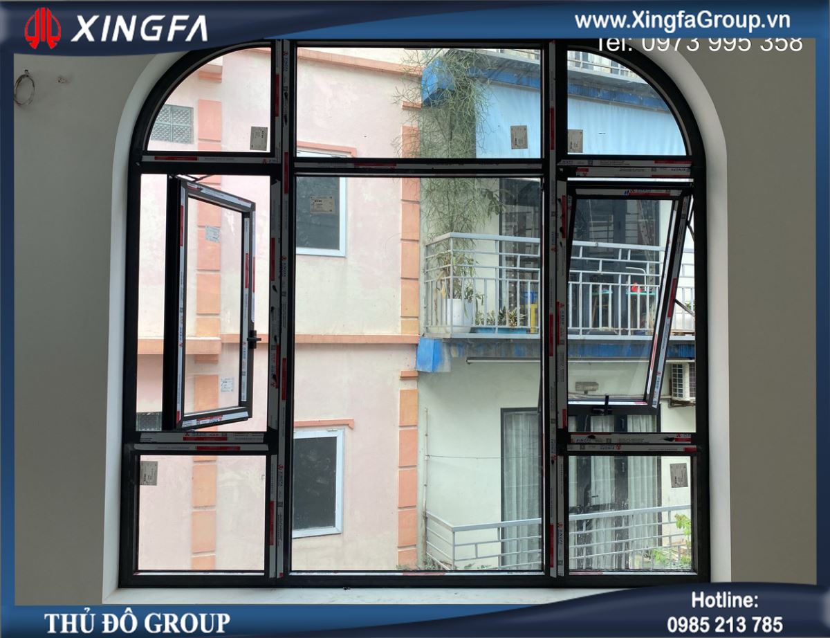 Hình ảnh cửa sổ mở hất 1 cánh kết hợp vách cố định uốn vòm nhôm Xingfa