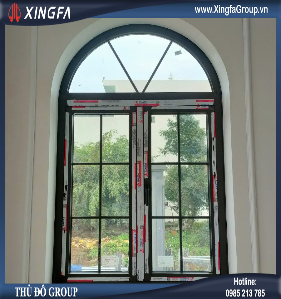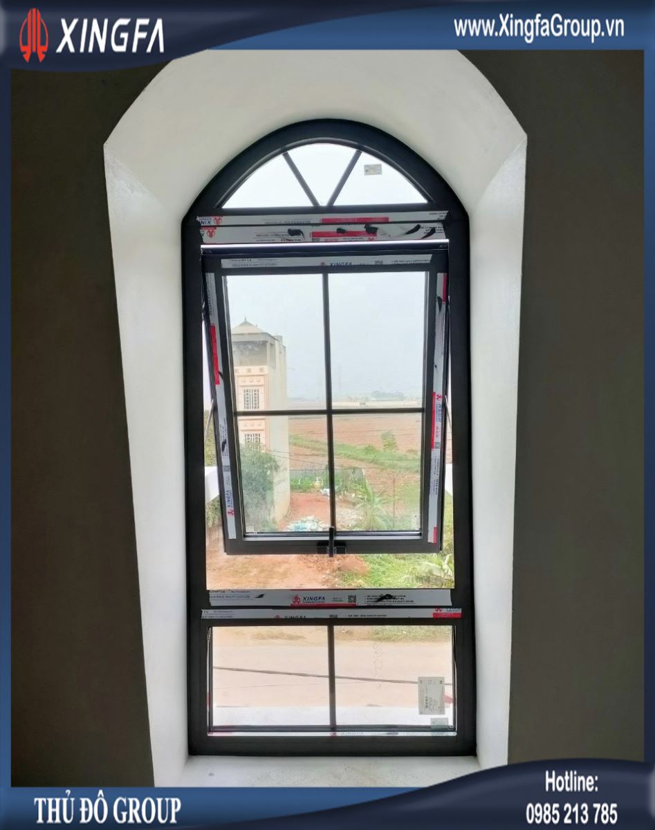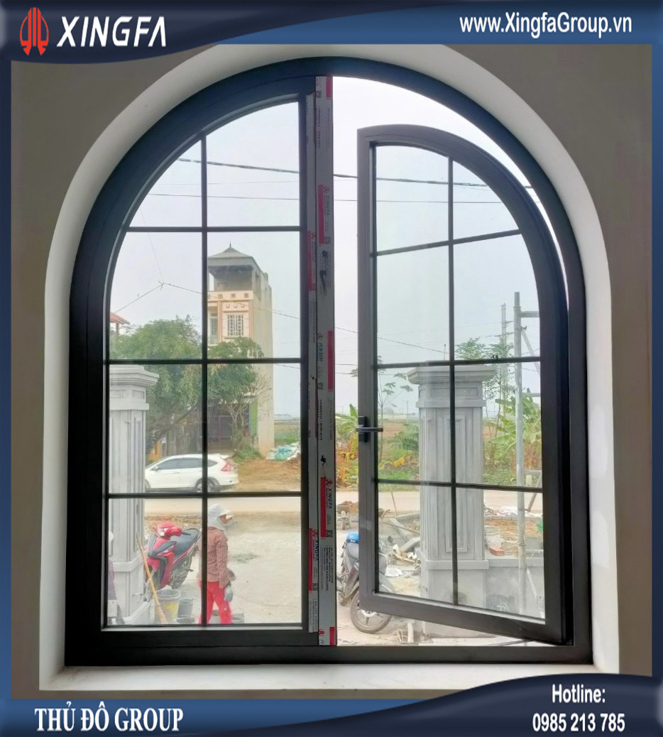 Hình ảnh cửa sổ mở quay 2 cánh nhôm Xingfa có vách kính mái vòm