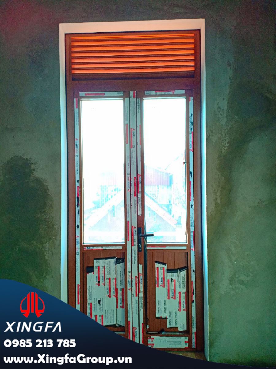 Hình ảnh cửa đi mở quay 2 cánh nhôm Xingfa mầu vân gỗ có chớp nhôm