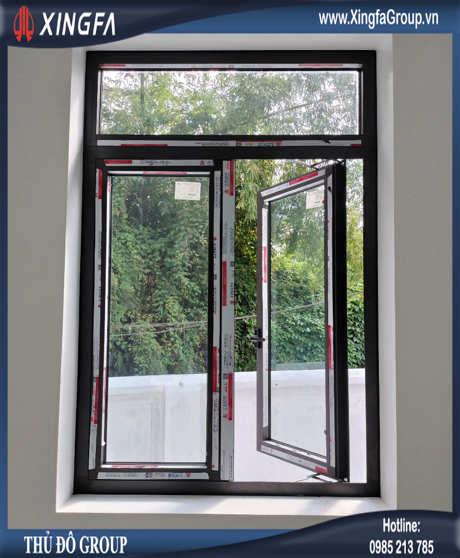 Hình ảnh cửa sổ mở quay 2 cánh nhôm Xingfa có vách cố định bên trên
