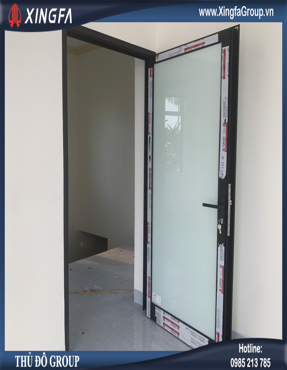 Hình ảnh cửa đi mở quay 1 cánh nhôm Xingfa đi kèm với kính trắng sữa